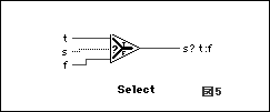 [s]コネクタに1(true)が入力されたとき、[t]コネクタからの値を[s?t:f]コネクタから出力します。逆に、[s]コネクタに0(false)が入力されたときには、[f]コネクタのデータを[s?t:f]コネクタから出力します。